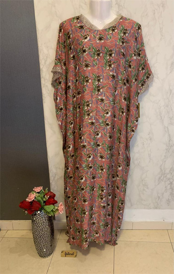 The model is wearing a fashion made from pure viscose, featuring a printed texture, long sleeves, round neck and a long length with a sweetheart neck Ladies