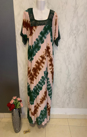 The model is wearing a fashion made from pure viscose, featuring a printed texture, long sleeves, round neck and a long length with a sweetheart neck Ladies