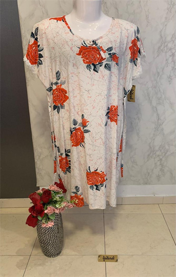 The model is wearing a fashion made from pure viscose, featuring a printed texture, long sleeves, round neck and a long length with a sweetheart neck Ladies